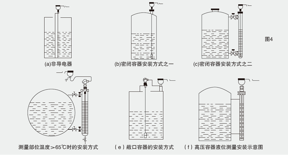 常見安裝方式見圖4,物位變送器與液體接觸部分由不銹鋼制造。